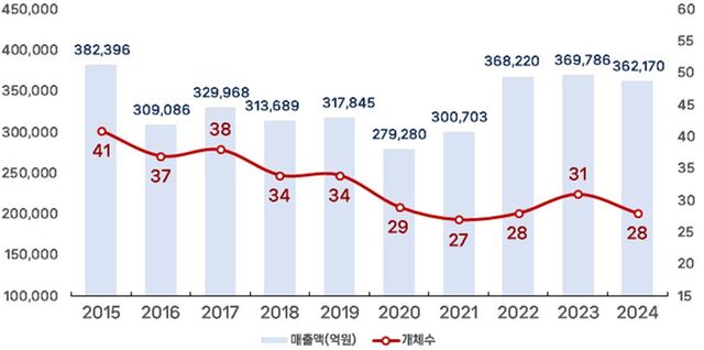 ºÎ»êÁö¿ª ±â¾÷ÀÇ ±â¹ÝÀÌ ´õ ¾àÇØÁ³´Ù. 2024³â ¸ÅÃâ¾× ±âÁØ Àü±¹ 1000´ë ±â¾÷¿¡¼ ºÎ»ê º»»ç ±â¾÷ÀÌ 28°÷±îÁö ÁÙ¾ú´Ù. HDÇö´ë¸¶¸°¼Ö·ç¼Ç°ú ±Øµ¿°Ç¼³ÀÇ ¼öµµ±Ç ÀÌÀü, ¿ÍÀÌÄÉÀ̽ºÆ¿ÀÇ ¸ÅÃâ °¨¼Ò Å»¶ôÀÌ °ãÄ¡¸ç ¡®30°³ ¸¶Áö³ë¼±¡¯¸¶Àú ÁöŰÁö ¸øÇß´Ù. Àü±¹ »óÀ§ 100´ë ±â¾÷¿¡´Â 5³â° ´Ü ÇÑ °÷µµ À̸§À» ¿Ã¸®Áö ¸øÇß´Ù.