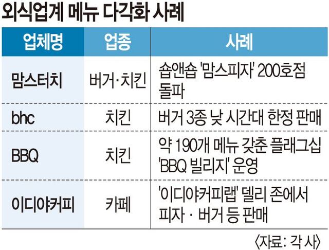 ¿Ü½Ä¾÷°è¿¡¼­ ¡°Çϳª¸¸ Àü¹®ÀûÀ¸·Î ÀßÇØ¼­´Â ½Â»êÀÌ ¾ø´Ù¡±´Â ºÐÀ§±â°¡ °­È­Çϰí ÀÖ´Ù. ġŲ Àü¹®Á¡¿¡¼­ ¹ö°Å¸¦ »ç°í ¹ö°Å ºê·£µå¿¡¼­ ÇÇÀÚ¸¦ ÁÖ¹®ÇÏ´Â ÀÏÀÌ ¸¹¾ÆÁø °Íµµ ±×·± ÀÌÀ¯¿¡¼­´Ù. Ä«Æä¿¡¼­ ½Ä»ç¸¦, ºßÆä¿¡¼­ µðÀúÆ®¸¸ Áñ±æ ¼öµµ ÀÖ´Ù. ³»¼ö ºÎÁøÀÌ Àå±âÈ­ÇÏ´Â °¡¿îµ¥ ¸Þ´º¸¦ ´Ù°¢È­ÇÏ°í ÆÇ¸Å ½Ã°£´ë¸¦ ³ÐÈ÷¸ç µ¹ÆÄ±¸¸¦ ¸¶·ÃÇÏ´Â °ÍÀ¸·Î ºÐ¼®µÈ´Ù.