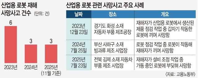 ½ÃÀåÁ¶»ç¾÷ü Æ÷ÃáºñÁî´Ï½ºÀλçÀÌÆ®¿¡ µû¸£¸é Àü ¼¼°è ÈÞ¸Ó³ëÀÌµå ·Îº¿ ½ÃÀå ±Ô¸ð´Â Áö³ÇØ 32¾ï8000¸¸ ´Þ·¯(¾à 5Á¶¿ø)¿¡¼ 2032³â 660¾ï ´Þ·¯(¾à 97Á¶¿ø)·Î °¡ÆÄ¸¥ ¼ºÀå¼¼¸¦ º¸ÀÏ °ÍÀ¸·Î Àü¸ÁµÈ´Ù. ÇÏÁö¸¸ ÈÞ¸Ó³ëÀÌµå ·Îº¿ÀÌ Àΰ£°ú ¸¶ÁÖÇÏ´Â ÀÏ»ó °ø°£¿¡ ÅõÀԵǴ »óȲ¿¡¼ÀÇ ÀáÀçÀû À§Ç輺¿¡ ´ëÇÑ ¿ì·Áµµ °í°³¸¦ µé°í ÀÖ´Ù. ½ÇÁ¦ ±¹³» Á¦Á¶¾÷ ÇöÀå¿¡¼µµ ·Îº¿ °ü·Ã ÀçÇØ »ç¸Á»ç°í°¡ ²ÙÁØÈ÷ À̾îÁö°í ÀÖ´Ù. °í¿ë³ëµ¿ºÎ¿¡ µû¸£¸é 2023³â 6°Ç, Áö³ÇØ 3°Ç, ¿ÃÇØ 11¿ù ±âÁØ 3°ÇÀÇ »ê¾÷¿ë ·Îº¿ »ç¸Á»ç°í(³¢ÀÓ¡¤ºÎµúÈû µî)°¡ ¹ß»ýÇß´Ù.