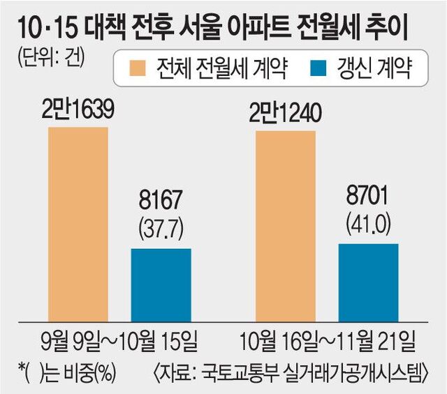24ÀÏ ±¹Åä±³ÅëºÎ ½Ç°Å·¡°¡°ø°³½Ã½ºÅÛ¿¡ µû¸£¸é 10¡¤15 ´ëÃ¥ ÀÌÈÄ 37Àϰ£(10¿ù 16ÀÏ~11¿ù 21ÀÏ) ü°áµÈ ¼­¿ï ¾ÆÆÄÆ® Àü¿ù¼¼ °è¾à 2¸¸1240°Ç °¡¿îµ¥ °»½Å°è¾àÀº 8701°ÇÀ¸·Î Áý°èµÆ´Ù. Àüü °è¾àÀÇ 41.0%´Ù. ´ëÃ¥ Àü 37Àϰ£(9¿ù 9ÀÏ~10¿ù 15ÀÏ)ÀÇ °»½Å°è¾à ºñÁß(37.7%)º¸´Ù 3.3% Æ÷ÀÎÆ® ³ô¾ÆÁ³´Ù.