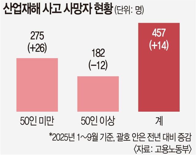 »êÀç ´Ù¹ß »ç¾÷Àå¿¡ ´ëÇÑ °¨µ¶ Ã¥ÀÓÀÌ ºÐ»êµÇ´Â °Í ¾Æ´Ï³Ä´Â ¿ì·Áµµ ÀÖ´Ù. Àü³¯ ³ëµ¿ºÎ ¹ßÇ¥¿¡ µû¸£¸é ¿ÃÇØ 9¿ù±îÁö ÀçÇØÁ¶»ç ´ë»ó »êÀç »ç¸ÁÀÚ´Â ÃÑ 457¸íÀ¸·Î Áö³ÇØ °°Àº ±â°£(443¸í)º¸´Ù 14¸í(3.2%) ´Ã¾ú´Ù. 50ÀÎ ÀÌ»ó »ç¾÷Àå¿¡¼´Â »êÀç »ç¸ÁÀÚ°¡ °¨¼ÒÇßÁö¸¸ 50ÀÎ ¹Ì¸¸ »ç¾÷ÀåÀÌ Áõ°¡¼¼¸¦ °ßÀÎÇß´Ù.