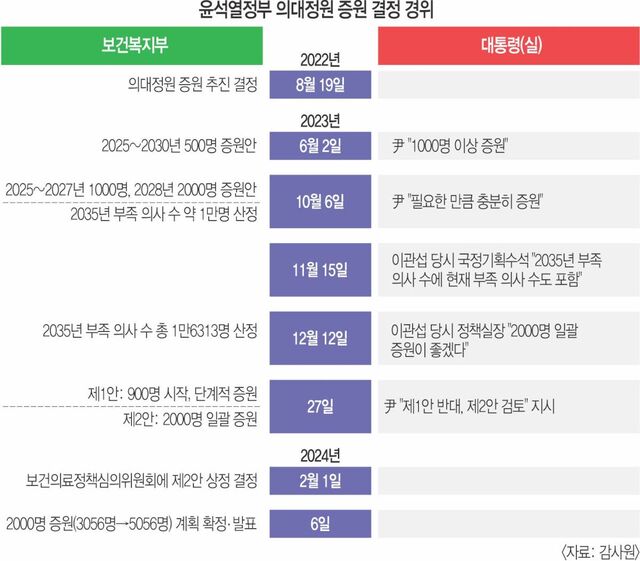 2023~2024³â ÁøÇàµÈ ÀÇ´ëÁ¤¿ø Áõ¿ø ÃßÁø °úÁ¤¿¡ ´ëÇÑ °¨»ç¿ø °¨»ç °á°ú 2023³â 6¿ù º¹ÁöºÎ´Â 2025~2030³â ¿¬°£ 500¸í¾¿ ÃÑ 3000¸íÀÇ ÀÇ»ç ÀηÂÀ» È®ÃæÇÏ´Â ³»¿ëÀÇ ¡®ÇʼöÀÇ·á °­È­´ëÃ¥¡¯À» º¸°íÇß´Ù. À± Àü ´ëÅë·ÉÀº ¡°±× Á¤µµ·Î´Â ºÒÃæºÐÇϰí (¿¬) 1000¸í ÀÌ»óÀº ´Ã·Á¾ß ÇÑ´Ù¡±´Â ÃëÁö·Î ¹Ý´ëÇß´Ù. ÀÌ¿¡ Á¶±ÔÈ« Àü º¹ÁöºÎ Àå°üÀº °°Àº ÇØ 10¿ù 2025~2027³â 1000¸í, 2028³â 1942¸í Áõ¿ø¾ÈÀ» º¸°íÇß´Ù. À± Àü ´ëÅë·ÉÀº ¶Ç ¡°ÇÊ¿äÇÑ ¸¸Å­ ÃæºÐÈ÷ ´õ ´Ã·Á¶ó. Áö±Ý Àǻ簡 ºÎÁ·ÇØ ³­¸®´Ù¡±¶ó°í ´äÇÑ °ÍÀ¸·Î ÆÄ¾ÇµÆ´Ù.