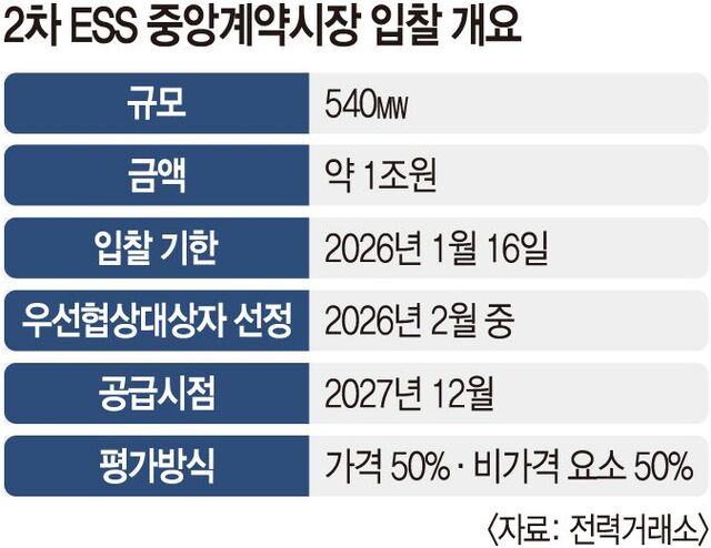 30ÀÏ ¾÷°è¿¡ µû¸£¸é Çѱ¹Àü·Â°Å·¡¼Ò´Â Áö³­ 27ÀÏ ¡®Á¦2Â÷ ESS Áß¾Ó°è¾à½ÃÀå ÀÔÂû °ø°í¡¯¸¦ ³»°í ÃÑ 540§Ó(¹èÅ͸® ¿ë·® ȯ»ê ½Ã 3.24±â°¡¿ÍÆ®½Ã(GWh)) ±Ô¸ðÀÇ ESS ¹ßÀü »ç¾÷ÀÚ ¼±Á¤ ÀýÂ÷¿¡ µé¾î°¬´Ù. ÀÔÂû ±âÇÑÀº ³»³â 1¿ù 16ÀÏÀÌ´Ù. Àü·Â°Å·¡¼Ò´Â ³»³â 2¿ù Áß ¿ì¼±Çù»ó´ë»óÀÚ¸¦ ¼±Á¤ÇÒ ¿¹Á¤ÀÌ´Ù.
