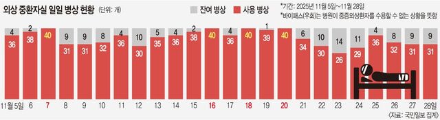ÀÌ·± ¾ÆÁִ뺴¿øÀÇ ¿Ü»óȯÀÚ ¼ö¿ëÀ» °¡·Î¸·´Â °Ç ¸¸¼ºÀûÀÎ º´»ó ºÎÁ·ÀÌ´Ù. ±¹¹ÎÀϺ¸´Â Áö³´Þ 5ÀϺÎÅÍ 28ÀϱîÁö 3ÁÖ°£ ¿Ü»óÁßȯÀÚ½Ç(TICU) º´»ó ÇöȲÀ» Á÷Á¢ ÆÄ¾ÇÇß´Ù. ±× °á°ú º´»ó Æ÷ȷΠȯÀÚ¸¦ ¼ö¿ëÇÒ ¼ö ¾ø´Â ¡®¹ÙÀÌÆÐ½º(¿ìȸ)¡¯ »óȲÀº 4ÀÏ(16.7%)¿¡ À̸£·¶°í, ¿©À¯ º´»óÀÌ 4°³ ÀÌÇÏÀÎ ³¯µµ 8ÀÏ(33.3%)¿¡ ´ÞÇß´Ù. Áö³ 3¿ù¿¡´Â ¹ÙÀÌÆÐ½º »óȲÀÌ 5ÀÏ ¿¬¼Ó ÀϾ¸é¼ ¿Ü»ó¼¾ÅÍ¿¡ ÀϽÃÀûÀÎ ¸¶ºñ±îÁö »ý°å´Ù. À̳¯ ¿ÀÀü TICU º´»ó Á¡À¯À²µµ 82.5%(33°³)¿¡ ´ÞÇß´Ù.