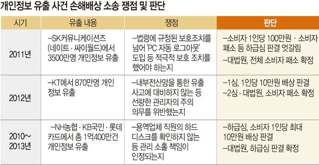 ÄíÆÎ Á¤º¸À¯Ãâ »ç°ÇÀÌ ¿ª´ë ÃÖ´ë ±Ô¸ðÀÇ Áý´Ü¼Ò¼ÛÀ¸·Î ±â·ÏµÉ °¡´É¼ºÀÌ Ä¿Áö°í ÀÖ´Ù. °ú°Å ½ÎÀÌ¿ùµå, KT µîÀÇ Á¤º¸À¯Ãâ ¼Ò¼ÛÀº Çϱ޽ɿ¡¼ ÀϺΠÀÎÁ¤µÆ´ø ¼ÕÇØ¹è»ó Ã¥ÀÓÀÌ ´ë¹ý¿ø¿¡¼ ÃÖÁ¾ ÆÐ¼Ò·Î È®Á¤µÇ´Â µî ÆÇ´ÜÀÌ ¾ù°¥·È´Ù. ¹Ý¸é 2014³â Ä«µå 3»çÀÇ Á¤º¸À¯Ãâ »ç°Ç¿¡¼´Â ¿ø°í 1¸í´ç ÃÖ´ë 10¸¸¿øÀÇ ¹è»ó ÆÇ°áÀÌ È®Á¤µÆ´Ù. ÄíÆÎÀ» »ó´ë·Î ÇÑ ¼Ò¼Û¿¡¼µµ ¹ý¿¡ ±ÔÁ¤µÈ Á¤º¸º¸È£ Àǹ«»Ó ¾Æ´Ï¶ó ´õ Àû±ØÀûÀÎ º¸È£ Àǹ«¸¦ ÀÌÇàÇß´ÂÁö°¡ ÁÖ¿ä ÀïÁ¡À¸·Î ´Ù·ïÁú Àü¸ÁÀÌ´Ù.