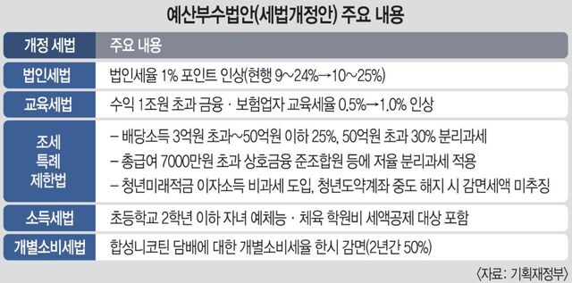 ³»³âºÎÅÍ ¸ðµç ±â¾÷ÀÇ ¹ýÀμ¼À²ÀÌ ÇöÇຸ´Ù 1% Æ÷ÀÎÆ® ¿À¸¥´Ù. ´ëÇü ±ÝÀ¶¡¤º¸Çè»ç¿¡ ºÎ°úµÇ´Â ±³À°¼¼À²µµ ±âÁ¸ 0.5%¿¡¼ 1.0%·Î µÎ ¹è ³ô¾ÆÁø´Ù. ¾×»óÇü ÀüÀÚ´ã¹è ¿ø·áÀÇ ´ëºÎºÐÀ» Â÷ÁöÇÏ´Â ÇÕ¼º´ÏÄÚÆ¾¿¡ ´ëÇØ 50%ÀÇ °æ°¨¼¼À²ÀÌ Àû¿ëµÇ°í, ÃʵîÇб³ 2Çгâ ÀÌÇÏ ÀÚ³àÀÇ ¿¹Ã¼´É¡¤Ã¼À° Çпøºñ´Â ¼¼¾×°øÁ¦ ´ë»ó¿¡ Æ÷ÇԵȴÙ. ±¹È¸´Â 2ÀÏ º»È¸ÀǸ¦ ¿¾î ³»³âµµ ¿¹»ê¾È°ú ÇÔ²² ¹ýÀμ¼¡¤±³À°¼¼¹ý °³Á¤¾È µî °¢Á¾ ¿¹»ê ºÎ¼ö¹ý¾ÈÀ» ó¸®Çß´Ù.
