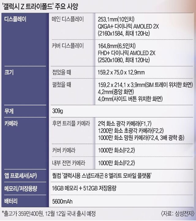 »ï¼ºÀüÀÚ´Â 2ÀÏ ¼¿ï ¼Ãʱ¸ »ï¼º °³²¿¡¼ ±âÀÚ°£´ãȸ¸¦ ¿°í °¶·°½Ã Z Æ®¶óÀÌÆúµå¸¦ °ø°³Çß´Ù. ¿ª´ë °¶·°½Ã ½Ã¸®Áî Áß °¡Àå Å« ȸé°ú °¡Àå ¾ãÀº µÎ²²°¡ ´«±æÀ» ²ø¾ú´Ù. Á¦Ç°À» ¿ÏÀüÈ÷ ÆîÃÆÀ» ¶§´Â ȸéÀÌ 253§®(10ÀÎÄ¡)·Î Å©°í, Á¢À¸¸é ¡®°¶·°½Ã Z Æúµå7¡¯°ú °°Àº 164.8§®(6.5ÀÎÄ¡) ¹Ù ÇüŰ¡ µÈ´Ù. µÎ²²´Â ¸ðµÎ Á¢¾úÀ» ¶§ 12.9§®, ÆîÃÆÀ» ¶§ °¡Àå ¾ãÀº È¸é ±âÁØ 3.9§®´Ù. °¡Àå ¾ãÀº Æúµå7º¸´Ùµµ 0.3§®°¡ ´õ ÁÙ¾îµç °ÍÀÌ´Ù. ¹èÅ͸® ¿ë·®Àº 5600mAh·Î Æú´õºí ½Ã¸®Áî Áß °¡Àå Å©´Ù. ¾ÈÁ¤ÀûÀÎ Àü·Â °ø±ÞÀ» À§ÇØ 3°³ ÆÐ³Î °¢°¢¿¡ 3¼¿ ¹èÅ͸®¸¦ žÀçÇß´Ù.