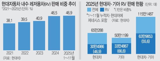 Çö´ëÂ÷ÀÇ RV ºñÁßÀº ÃÖ±Ù 5³â°£ ²ÙÁØÈ÷ »ó½ÂÇß´Ù. 2021³â 38.1%, 2022³â 39.5%, 2023³â 40.9%·Î óÀ½ 40%´ë¸¦ ³Ñ°å´Ù. Áö³ÇØ¿¡´Â 46.5%·Î Àü³â ´ëºñ 5% Æ÷ÀÎÆ® ÀÌ»ó ¶Ù¾ú´Ù. Á¦³×½Ã½º¸¦ Æ÷ÇÔÇÑ Àüü ÆÇ¸Å ±¸Á¶°¡ RV Áß½ÉÀ¸·Î ÀçÆíµÇ´Â È帧ÀÌ´Ù.