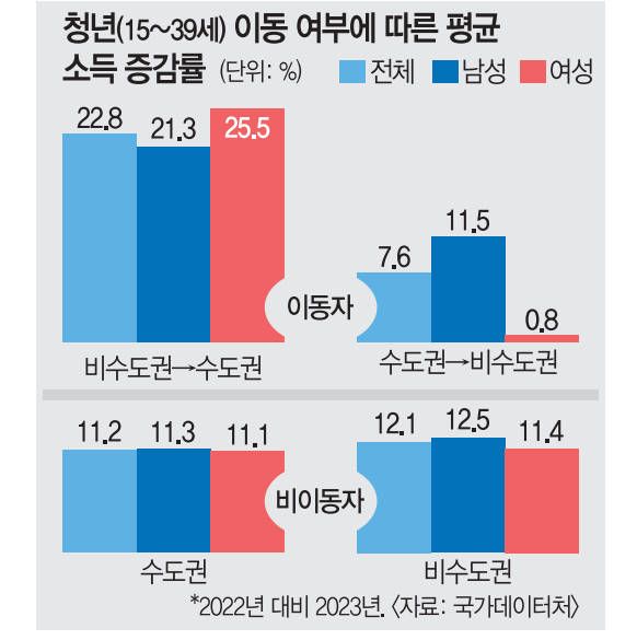 Áö¹æ¿¡¼ ¼öµµ±ÇÀ¸·Î À̵¿ÇÑ Ã»³âÃþ(15~39¼¼)ÀÇ ¼ÒµæÀÌ 22% ³Ñ°Ô ´Ã¾î³ª´Â µ¿¾È ºñ¼öµµ±Ç¿¡ ¸Ó¹® û³âÃþ ¼ÒµæÀº 12.1% ´Ã¾î³ª´Â µ¥ ±×Ä£ °ÍÀ¸·Î ³ªÅ¸³µ´Ù. Áö¿ªº°·Î´Â ´ë°æ±Ç(´ë±¸¡¤°æºÏ) û³âÀÌ ¼¿ï·Î À̵¿ÇßÀ» ¶§ ¼Òµæ Áõ°¡À²ÀÌ °¡Àå ³ô¾Ò´Ù.