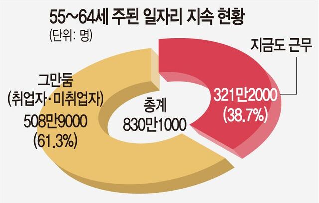 ±¹°¡µ¥ÀÌÅÍó °æÁ¦È°µ¿Àα¸Á¶»ç °í·ÉÃþ ºÎ°¡Á¶»ç¿¡ µû¸£¸é ¿ÃÇØ 5¿ù ±âÁØ 55~64¼¼ Àα¸ Áß »ý¾Ö Ãë¾÷ °æÇèÀÌ ÀÖ´Â »ç¶÷Àº 844¸¸1800¸íÀÌ´Ù. ÀÌ Áß ÁÖµÈ ÀÏÀÚ¸®(»ý¾Ö °¡Àå ¿À·¡ ±Ù¹«ÇÑ ÀÏÀÚ¸®)¸¦ Áö¼ÓÇÏ´Â »ç¶÷Àº 321¸¸2000¸í(38.7%), ±×¸¸µÐ »ç¶÷Àº 508¸¸9000¸í(60.5%)À¸·Î Áý°èµÆ´Ù.