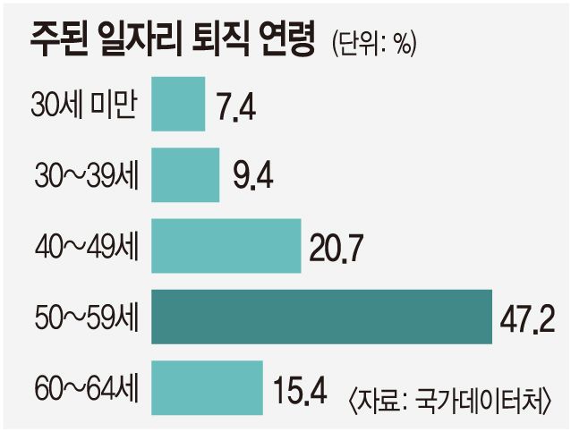 Á¶»ç ´ë»ó ¿¬·ÉÀ» 55~79¼¼·Î ¹üÀ§¸¦ ³ÐÇôµµ ÁÖµÈ ÀÏÀÚ¸® ÅðÁ÷ ³ªÀÌ´Â 52.9¼¼, Æò±Õ ±Ù¼Ó ±â°£Àº 17³â 6.6°³¿ù(³²¼º 21³â 6.6°³¿ù, ¿©¼º 13³â 8.1°³¿ù)À̾ú´Ù. ÁÖµÈ ÀÏÀÚ¸® ÅðÁ÷ ¿¬·É°ú Æò±Õ ±Ù¼Ó±â°£Àº Áö¼ÓÀûÀ¸·Î ³ô¾ÆÁö´Â Ãß¼¼±â´Â ÇÏÁö¸¸, ÁßÀå³â »ó´ç¼ö´Â ¡®»ç¾÷ºÎÁø, Á¶¾÷Áß´Ü, ÈÞ¡¤Æó¾÷¡¯(28.7%) ¡®°Ç°ÀÌ ÁÁÁö ¾Ê¾Æ¼¡¯(18.6%) µîÀÇ ÀÌÀ¯·Î ÁÖµÈ ÀÏÀÚ¸®¸¦ ¶°³ª°í ³ëÈĸ¦ À§ÇØ ´Ù½Ã ÀçÃë¾÷ ½ÃÀå¿¡ ¶Ù¾îµå´Â ½ÇÁ¤ÀÌ´Ù.