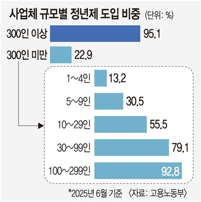 Àϰ¢¿¡¼´Â Á¤³â Á¦µµ ÀÚü°¡ ³ëµ¿½ÃÀå¿¡ Á¦´ë·Î Á¤ÂøÇÏÁö ¸øÇß´Ù°í ÁöÀûÇÑ´Ù. ±Ô¸ð°¡ ÀÛÀº ±â¾÷µéÀº ¾Æ¿¹ Á¤³âÁ¦¸¦ ¿î¿µÇÏÁö ¾Ê´Â °æ¿ì°¡ ¸¹±â ¶§¹®ÀÌ´Ù. °í¿ë³ëµ¿ºÎ Á¶»ç¿¡¼ 300ÀÎ ÀÌ»ó ±â¾÷ÀÇ Á¤³âÁ¦ ¿î¿µ ºñÀ²Àº 95.1%, 100ÀÎ ÀÌ»ó ±â¾÷Àº 93.4%¿´Áö¸¸, 100ÀÎ ¹Ì¸¸ÀÇ °æ¿ì ±× ºñÁßÀÌ 22.5%·Î ¶Ò ¶³¾îÁ³´Ù.