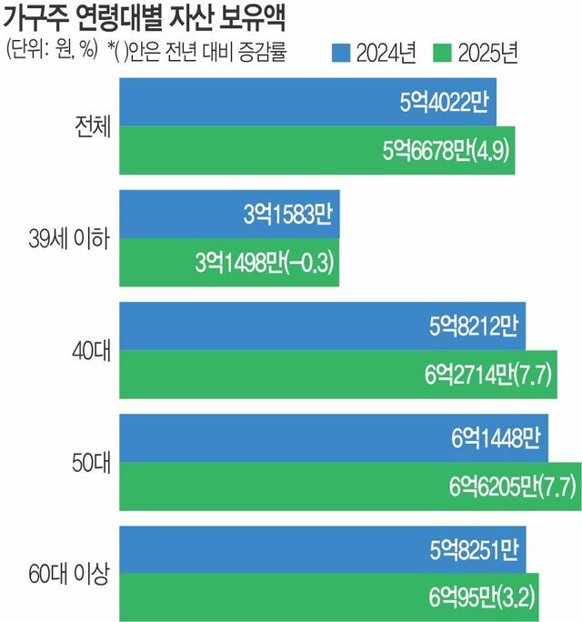±¹°¡µ¥ÀÌÅÍó¿Í ±ÝÀ¶°¨µ¶¿ø, Çѱ¹ÀºÇàÀÌ 4ÀÏ ¹ßÇ¥ÇÑ ¡®2025³â °¡°è±ÝÀ¶º¹ÁöÁ¶»ç¡¯¿¡ µû¸£¸é Áö³ 3¿ù ¸» ±âÁØ °¡±¸´ç Æò±Õ ÀÚ»êÀº 1³â Àüº¸´Ù 4.9% ´Ã¾î³ 5¾ï6678¸¸¿øÀÌ´Ù. ºÎµ¿»êÀ» Áß½ÉÀ¸·Î ½Ç¹°ÀÚ»ê °¡°ÝÀÌ 5.8% ±ÞµîÇÑ ¿µÇâÀÌ ¹Ý¿µµÆ´Ù. °¡±¸´ç Æò±Õ ºÎä´Â 9534¸¸¿øÀ¸·Î 4.4% ´Ã¾úÁö¸¸ ÀÚ»ê Áõ°¡ ÆøÀÌ À̸¦ ¿ôµ¹¸ç °¡±¸´ç Æò±Õ ¼øÀÚ»ê(4¾ï7144¸¸¿ø)µµ 5.0% ´Ã¾ú´Ù.