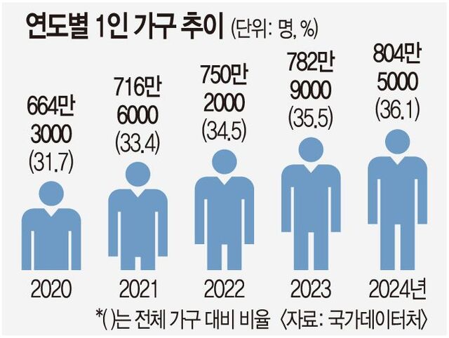 ±¹°¡µ¥ÀÌÅÍó°¡ 9ÀÏ ¹ßÇ¥ÇÑ ¡®2025 Åë°è·Î º¸´Â 1ÀÎ °¡±¸¡¯¿¡ µû¸£¸é Áö³ÇØ 1ÀÎ °¡±¸´Â ÃÑ 804¸¸5000°¡±¸·Î Àü³âº¸´Ù 6.3%(8¸¸3000°¡±¸) Áõ°¡Çß´Ù. 1ÀÎ °¡±¸°¡ Â÷ÁöÇÏ´Â ºñÁßÀº 2019³â 30%¸¦ ³Ñ¾î¼± ÈÄ 2022³â 34.5%, 2023³â 35.5%, 2024³â 36.1%·Î ÇØ¸¶´Ù ´Ã°í ÀÖ´Ù.