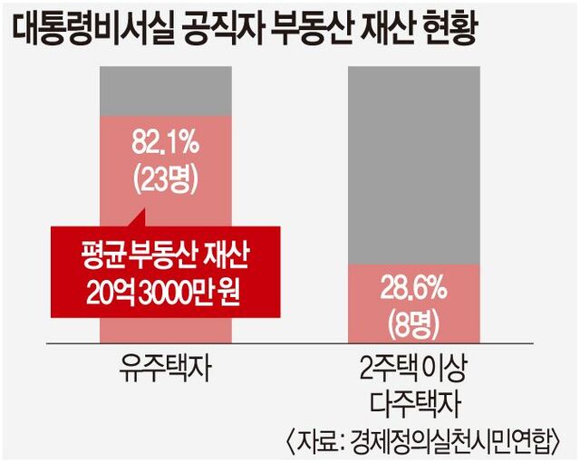 ÀÌÀç¸íÁ¤ºÎ ´ëÅë·Éºñ¼½Ç °øÁ÷ÀÚµéÀÇ Æò±Õ ºÎµ¿»ê Àç»êÀÌ ±¹¹Î Æò±Õº¸´Ù 5¹è °¡±îÀÌ ¸¹Àº °ÍÀ¸·Î Á¶»çµÆ´Ù. 3¸í Áß 1¸íÀº ¼¿ï °³²3±¸(°³²¡¤¼ÃÊ¡¤¼ÛÆÄ±¸)¿¡ º»ÀÎ ¹× ¹è¿ìÀÚ ¸íÀÇ ÁÖÅÃÀ» º¸À¯Çß´Ù.