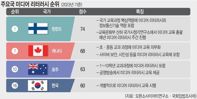 ÇØ¿Ü ÁÖ¿ä±¹µéÀº ¹Ìµð¾î ¸®ÅÍ·¯½Ã¸¦ °ø±³À°ÀÇ ÇÙ½É °úÁ¦·Î Á¦µµÈÇϰí ÀÖ´Ù. Çɶõµå´Â 2016³â ±¹°¡ ±³À°°úÁ¤¿¡ ¹Ìµð¾î ¸®ÅÍ·¯½Ã¸¦ ÇÙ½É ¿ª·®À¸·Î Æ÷ÇÔ½ÃÄ×°í, ij³ª´Ù¿Í È£ÁÖ ¿ª½Ã ÃÊ¡¤Áßµî ±³°ú°úÁ¤¿¡¼ ¹Ìµð¾î ±³À°À» ½Ç½ÃÇϰí ÀÖ´Ù. ¿ÀǼһçÀÌ¾îÆ¼¿¬±¸¼Ò(OSI)°¡ ¹ßÇ¥ÇÑ 2023³â ±âÁØ ¹Ìµð¾î ¸®ÅÍ·¯½Ã Áö¼ö¿¡¼ Çɶõµå´Â 74Á¡À¸·Î 47°³±¹ Áß 1À§¸¦ ±â·ÏÇß´Ù. ij³ª´Ù¿Í È£ÁÖ´Â °¢°¢ 7À§¿Í 10À§¿´À¸¸ç, Çѱ¹Àº 16À§¿¡ ¸Ó¹°·¶´Ù.